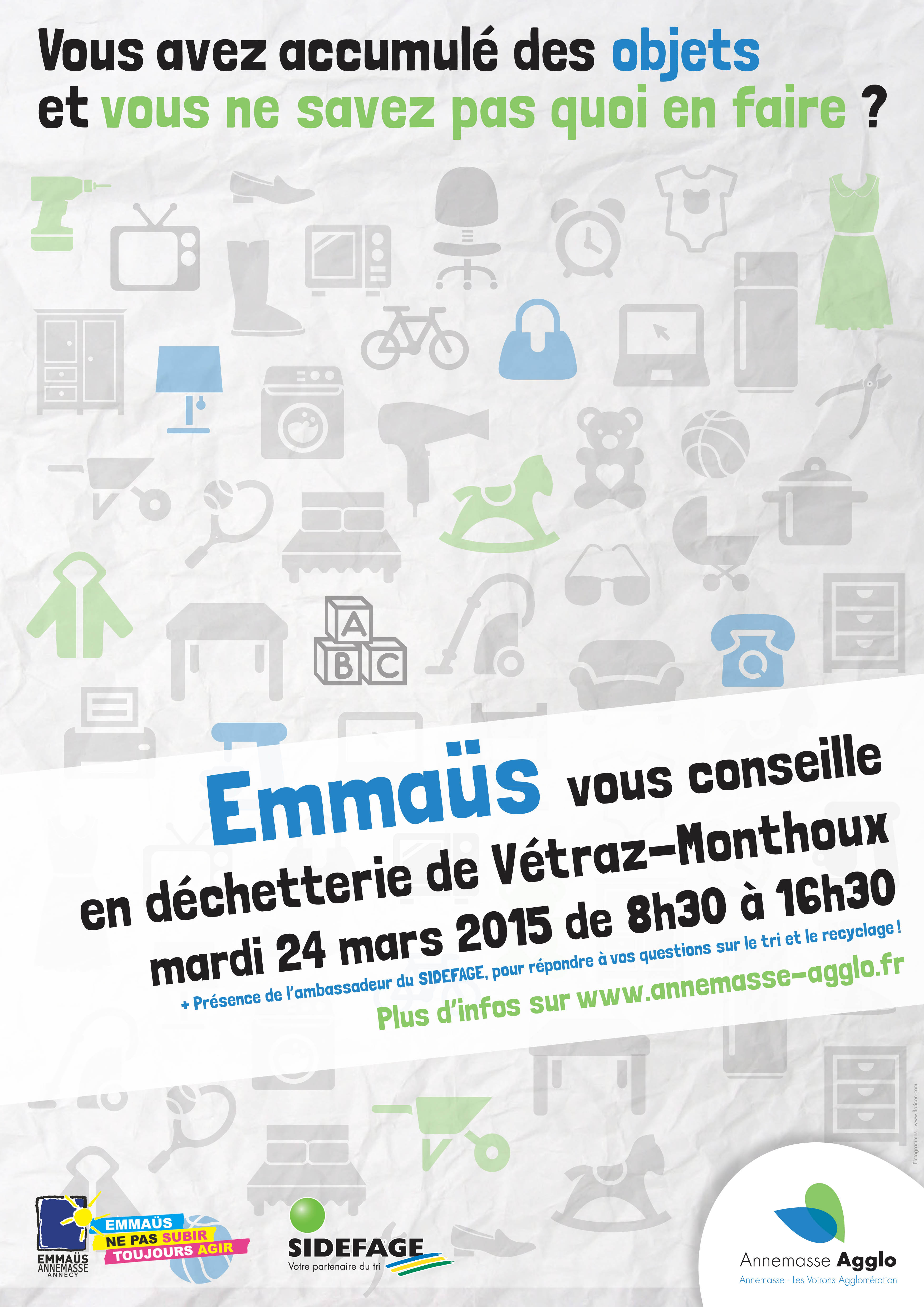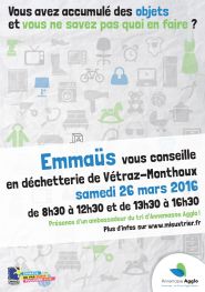 Notre Communauté, en partenariat avec l’Agglomération d’Annemasse et le Sidefage, sera présente sur la déchetterie de Vetraz-Monthoux le samedi 26 mars 2016, afin de sensibiliser nos concitoyens et par quelques informations pratiques leur permettre d’adopter le bon réflexe.